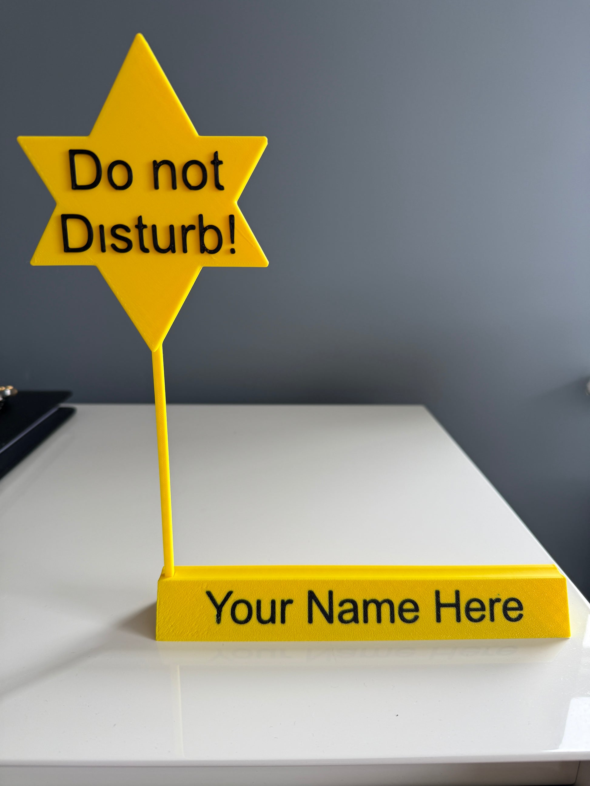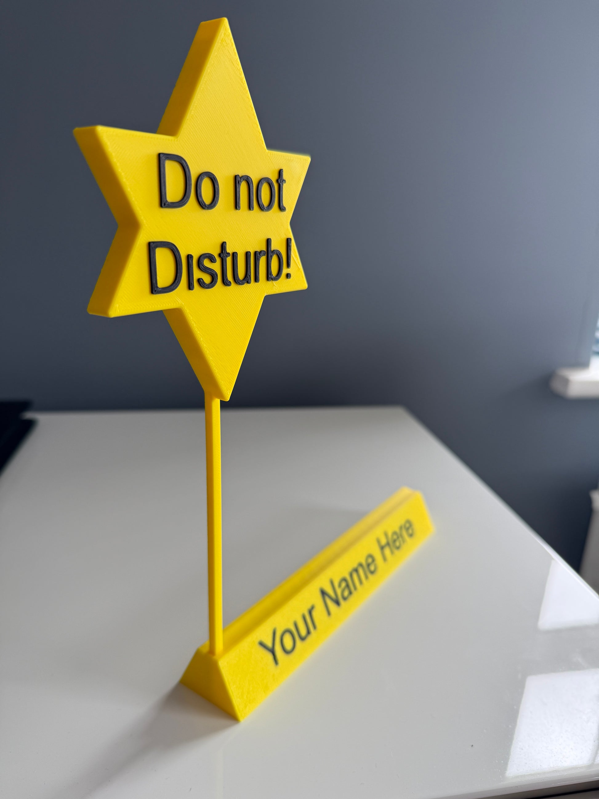 A 3D printed personalised name plate for serious office and meeting use.